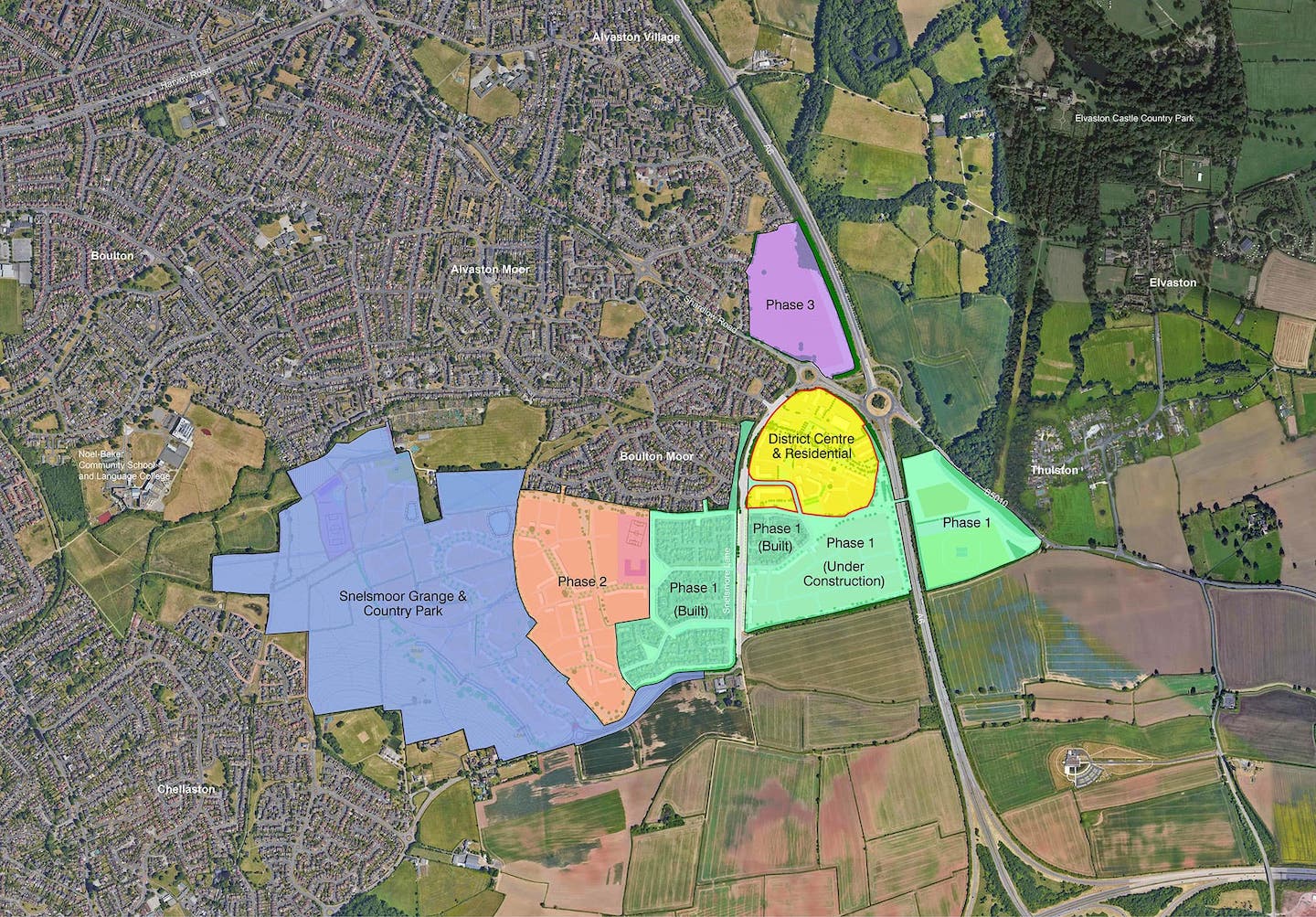 The A6(T) and Shardlow Road/Chellaston Lane roundabouts are located immediately north of the site. Improvements to these junctions has been secured through the permitted Boulton Moor Phase 2 development and will also be secured through the Snelsmoor Grange development which is currently being determined by the Local Planning Authority. These works will include the installation of traffic lights in combination with carriageway widening to improve the operation of this area. The offsite highway works include junction and traffic light improvements to the Alvaston District Centre.